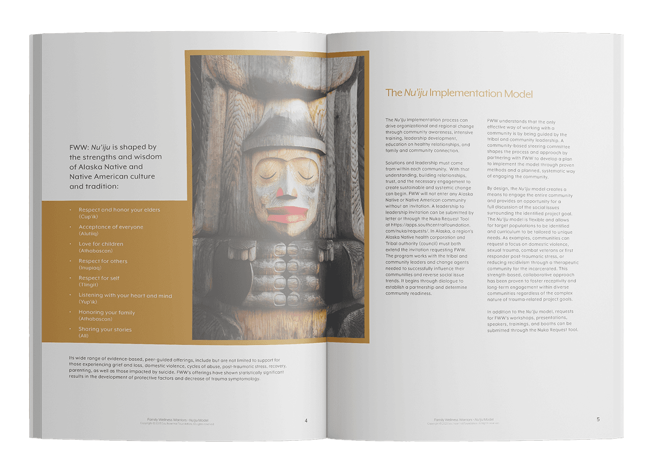Objective: The client's request was for a visually appealing report incorporating Alaskan Native photographs to illustrate the initiatives of Family Wellness Warriors: Nuiju within the Alaskan community.